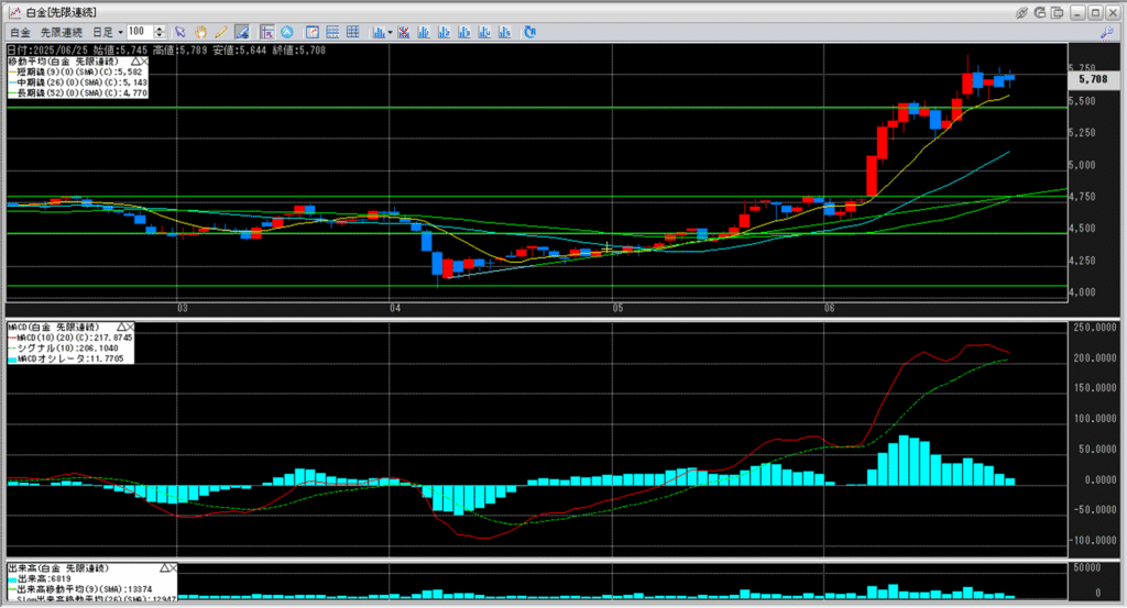 5,500円を超えてきましたので、白金高騰が続く可能性が高まっています。