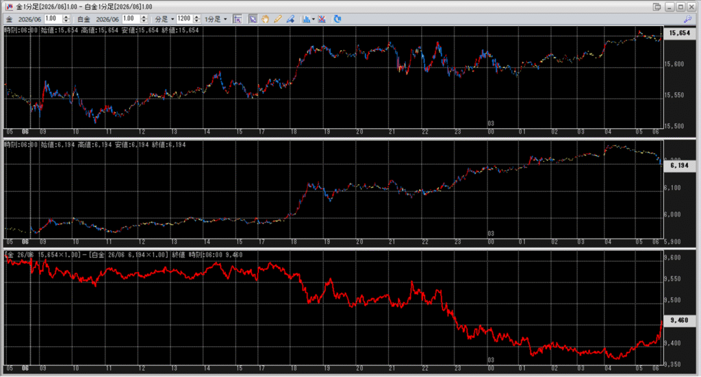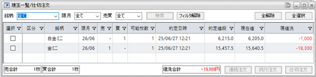 併せて、鞘縮小の仕掛け金ミニ売り1枚-白金ミニ買い1枚を保持しています。