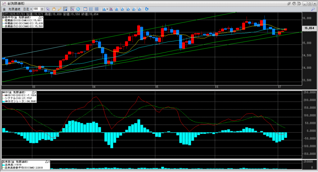 移動平均の短期線は下向き、中期線は上向き、長期線は上向きとなっています。