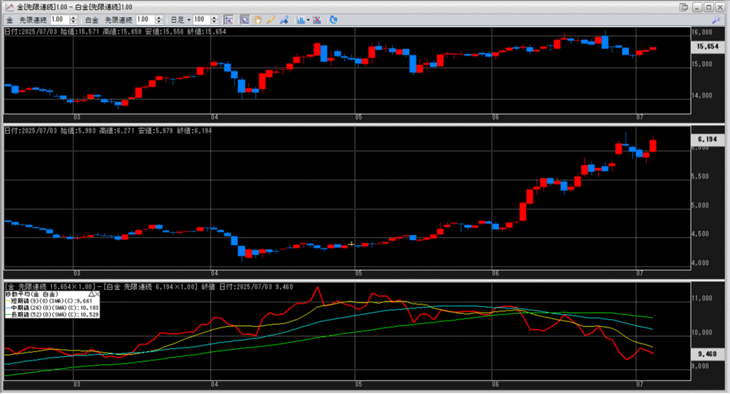 下記に金白金鞘の移動平均線のチャートを貼り付けています。