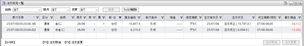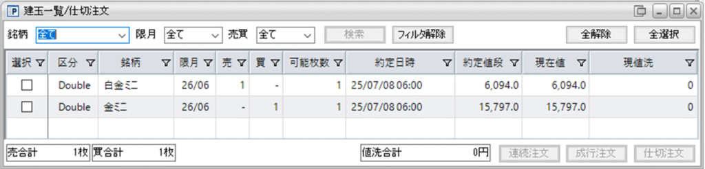 そして、鞘拡大の仕掛け金ミニ買い1枚-白金ミニ売り1枚を新規で建てました。