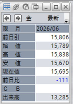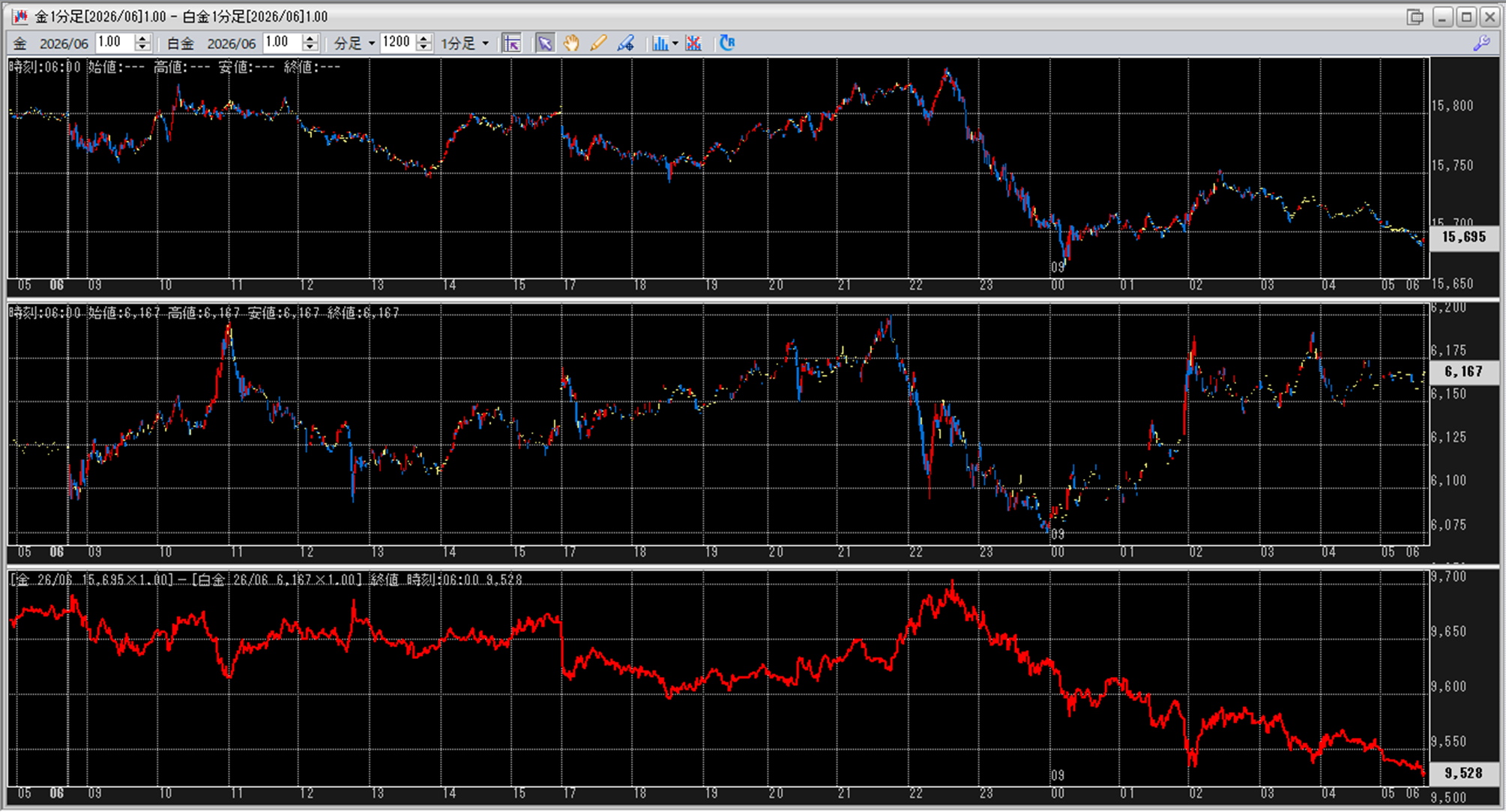 鞘拡大の仕掛け金ミニ買い1枚-白金ミニ売り1枚を保持しています。