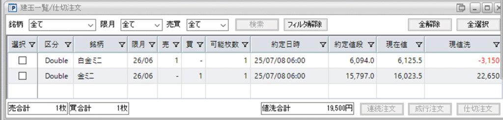 鞘拡大の仕掛け金ミニ買い1枚-白金ミニ売り1枚を保持しています。