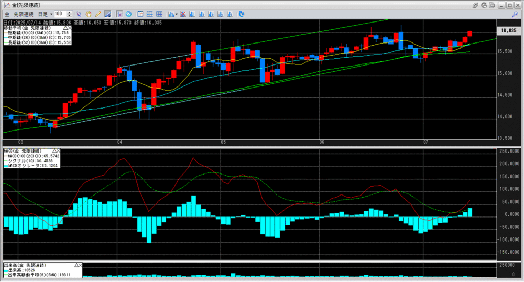 金白金鞘のボリンジャーバンドおよび移動平均線が鞘拡大傾向となっています。