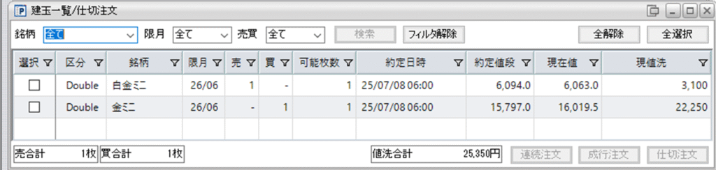 鞘拡大の仕掛け金ミニ買い1枚-白金ミニ売り1枚を保持しています。