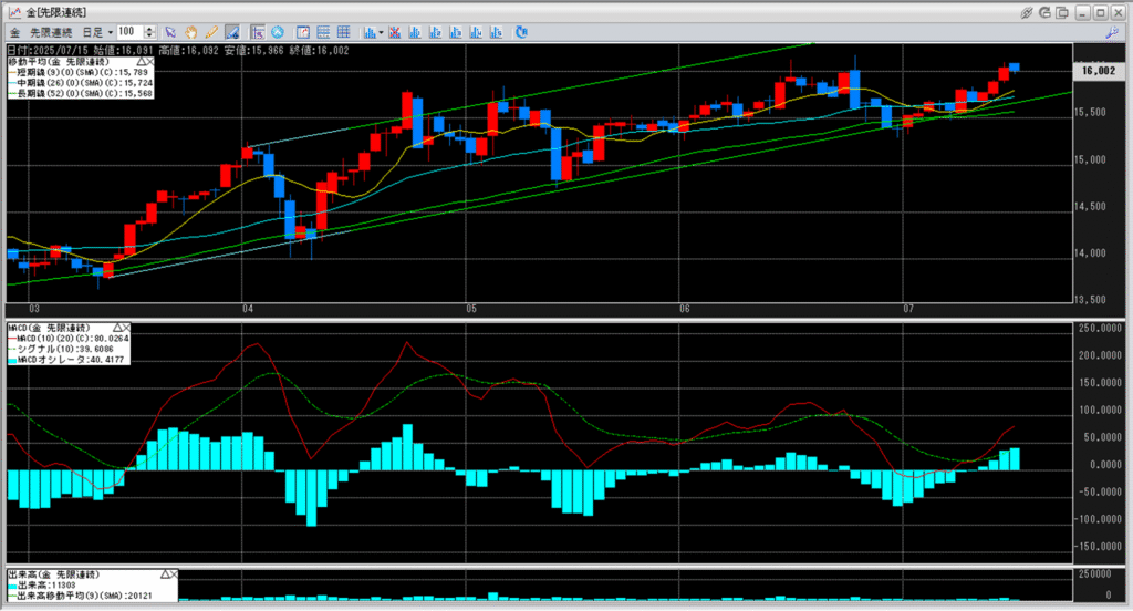 金白金鞘のボリンジャーバンドおよび移動平均線が鞘拡大傾向となっています。