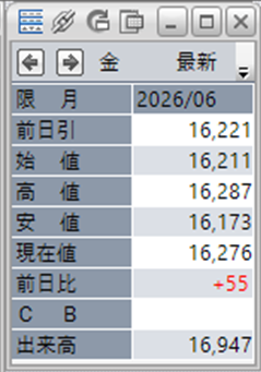 金価格は、6:00時点での終値は16,276円となっています。
