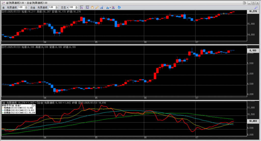 下記に金白金鞘の移動平均線のチャートを貼り付けています。