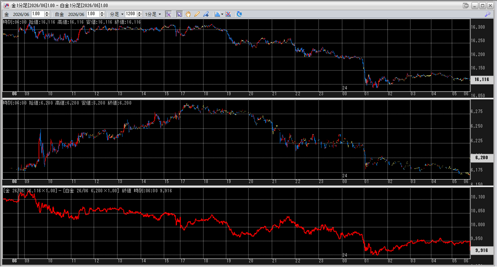 下:金白金鞘(金白金の価格差 = 金1グラムの価格 - 白金1グラムの価格)