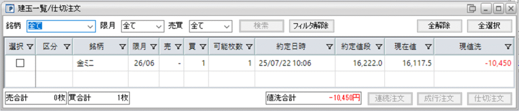 引き続き、金ミニ買いを片張りで1枚を保持しています。