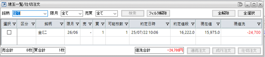 引き続き、金ミニ買いを片張りで1枚を保持しています。