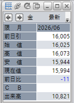 金価格は、6:00時点での終値は15,994円となっています。