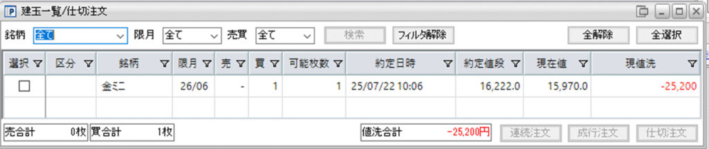 引き続き、金ミニ買いを片張りで1枚を保持しています。