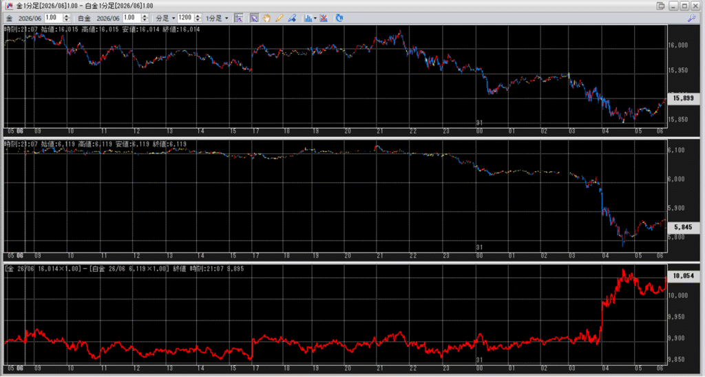 下:金白金鞘(金白金の価格差 = 金1グラムの価格 - 白金1グラムの価格)