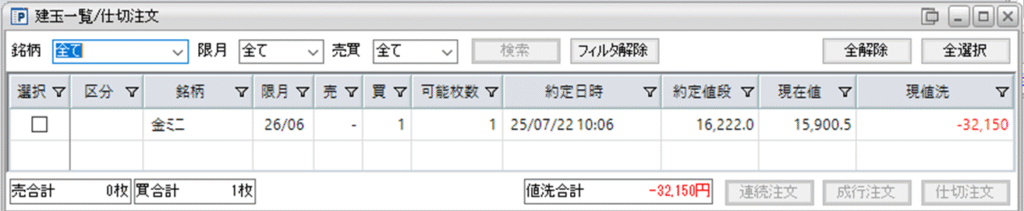 引き続き、金ミニ買いを片張りで1枚を保持しています。