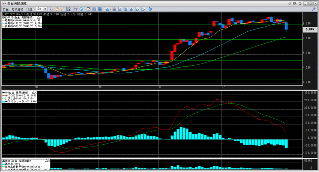 移動平均線の中で真ん中に位置している中期線6,078円を割り込んで、