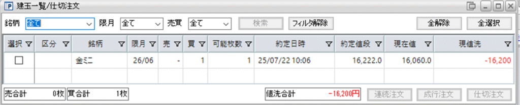 引き続き、金ミニ買いを片張りで1枚を保持しています。