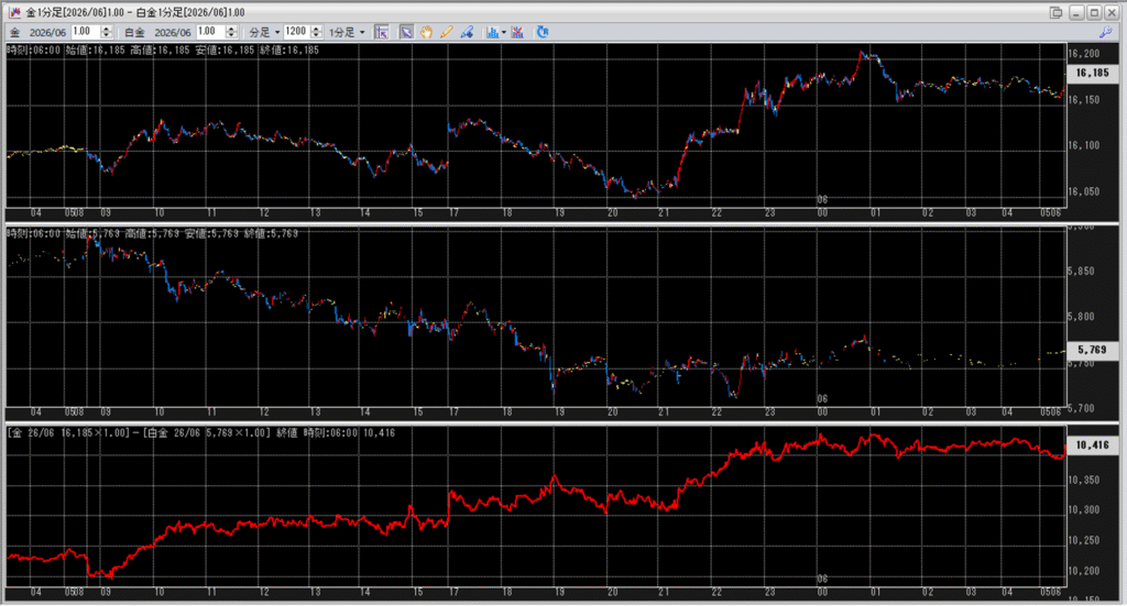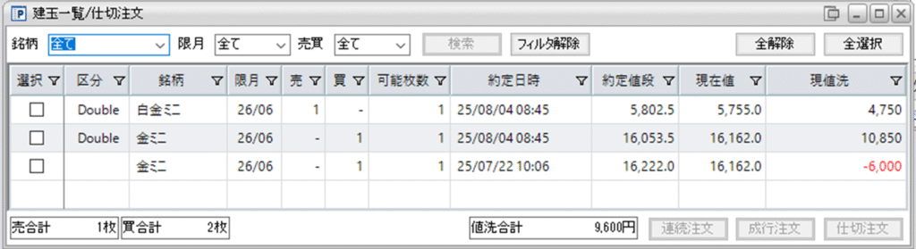 併せて、新規に鞘拡大の仕掛け金ミニ買い1枚-白金ミニ売1枚の1組も保持しています。