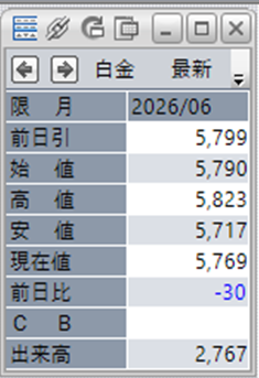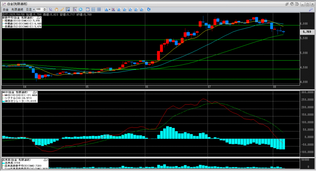 5,500円を超え、白金高騰が続き、5,750円を一旦の天井とした後、