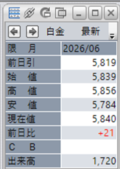 5,500円を超え、白金高騰が続き、5,750円を一旦の天井とした後、