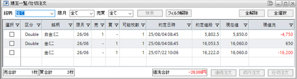 金ミニ買い1枚-白金ミニ売1枚は、含み損となっており、
