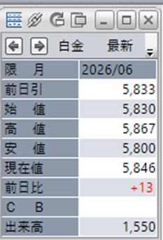 5,500円を超え、白金高騰が続き、5,750円を一旦の天井とした後、