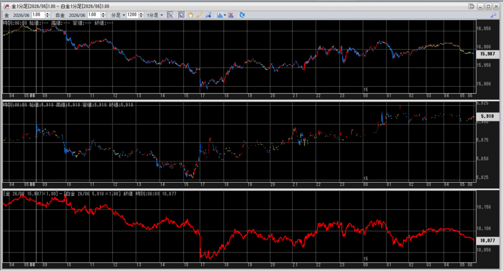 金白金鞘は縮小し、金ミニ買い1枚-白金ミニ売1枚は、含み損となっており、
