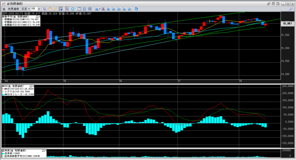 移動平均線の真ん中に位置している中期線16,041円を割り込んで、