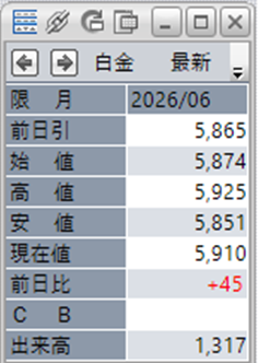 5,500円を超え、白金高騰が続き、5,750円を一旦の天井とした後、
