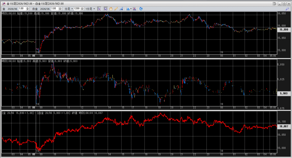 金白金鞘は拡大し、金ミニ買い1枚-白金ミニ売1枚の含み損は減りましたが、