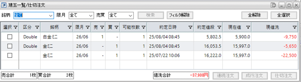 併せて、鞘拡大の仕掛け金ミニ買い1枚-白金ミニ売1枚の1組も保持しています。
