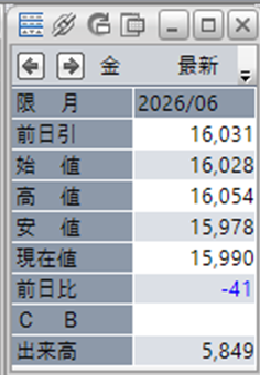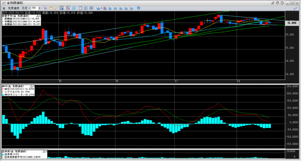 移動平均線の真ん中に位置している中期線16,061円を割り込んで、