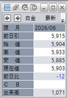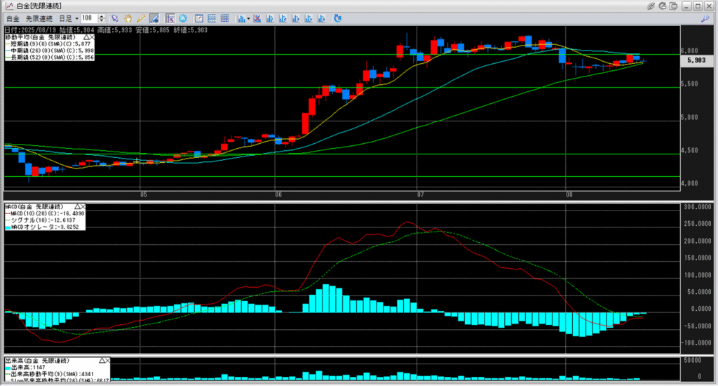 5,500円を超え、白金高騰が続き、5,750円を一旦の天井とした後、