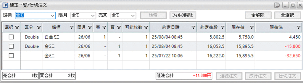 併せて、鞘拡大の仕掛け金ミニ買い1枚-白金ミニ売1枚の1組も保持しています。