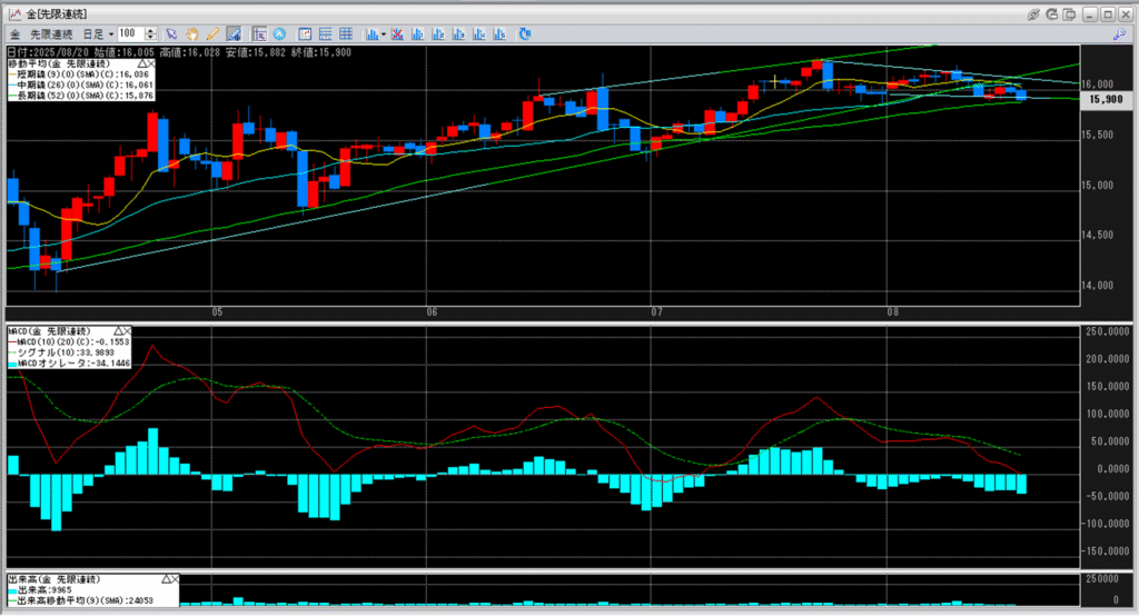 移動平均線の真ん中に位置している短期線16,036円を割り込んで、
