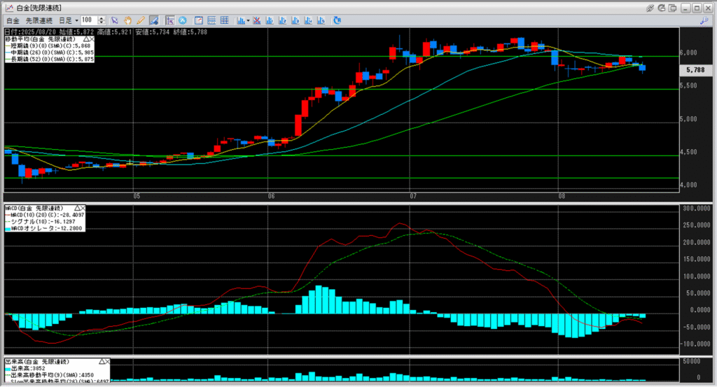 5,500円を超え、白金高騰が続き、5,750円を一旦の天井とした後、