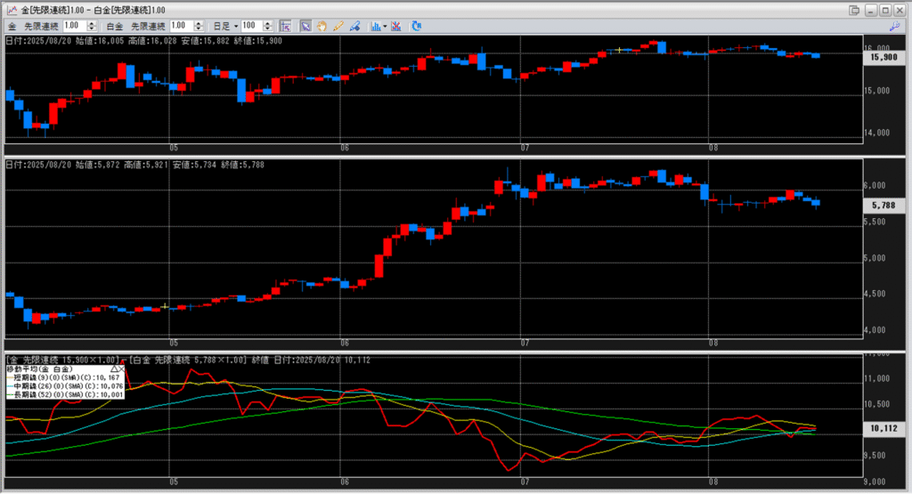 下記に金白金鞘の移動平均線のチャートを貼り付けています。