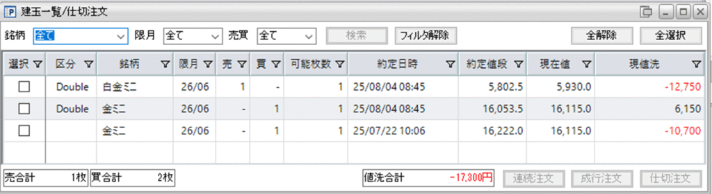 併せて、鞘拡大の仕掛け金ミニ買い1枚-白金ミニ売1枚の1組も保持しています。