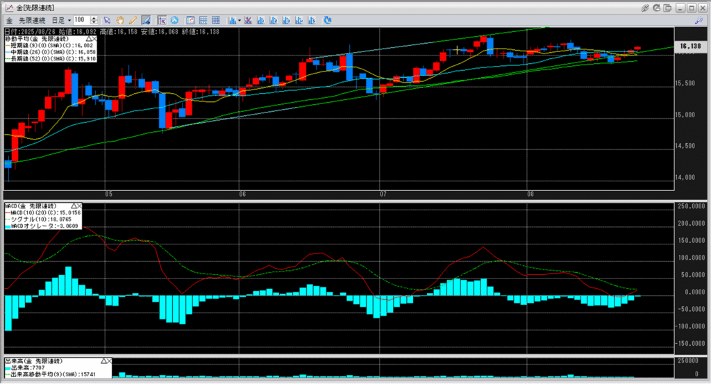 移動平均線の一番上に位置している中期線16,058円を越えて、