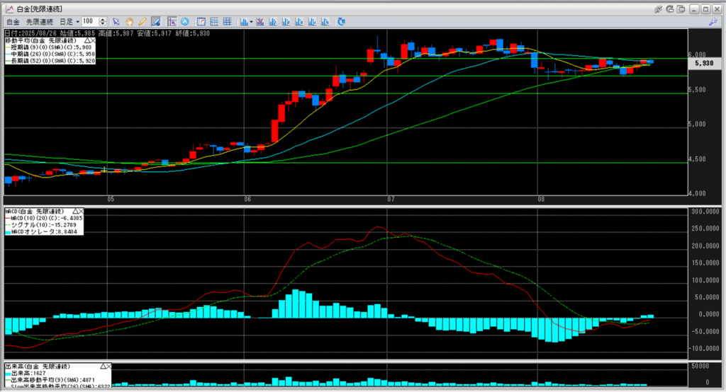 5,500円を超え、白金高騰が続き、5,750円を一旦の天井とした後、