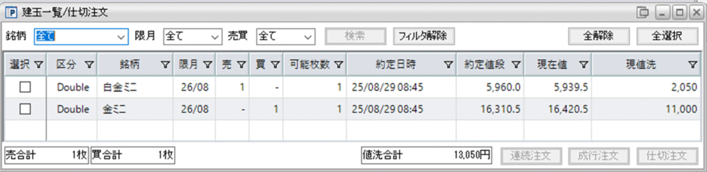 そして、また金白金鞘の拡大の仕掛け金ミニ買い1枚-白金ミニ売1枚を建てました。