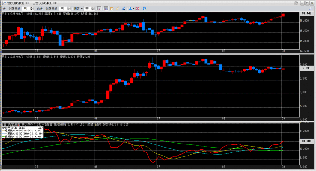 下記に金白金鞘の移動平均線のチャートを貼り付けています。