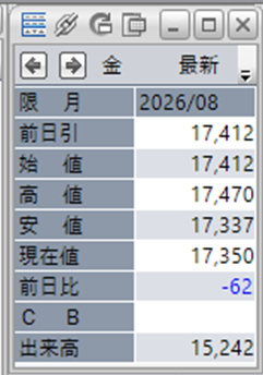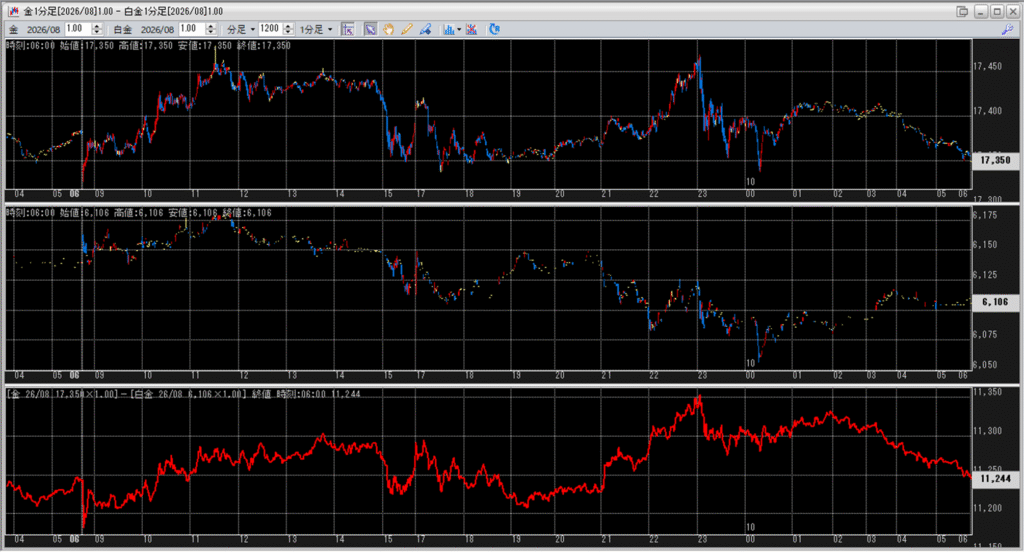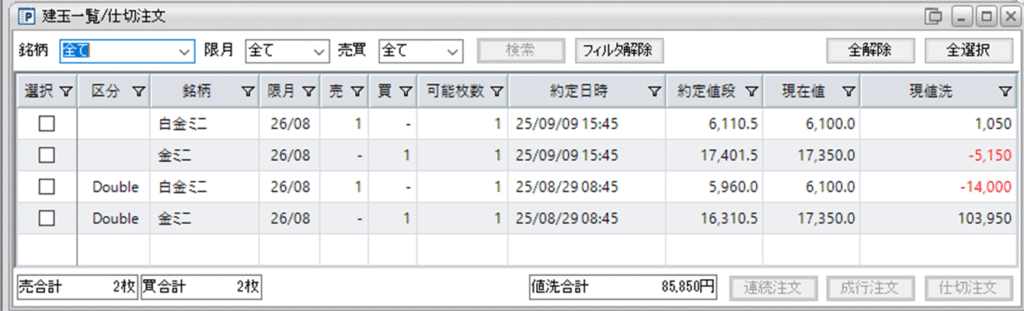さらに金白金鞘の拡大仕掛け金ミニ買い1枚-白金ミニ売1枚を追加で建てています。