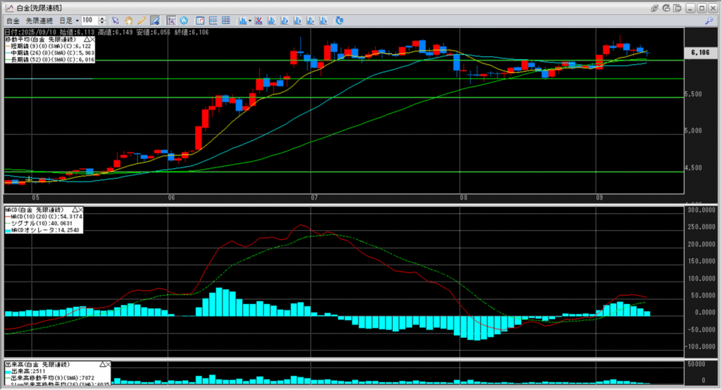 5,500円を超え、白金高騰が続き、5,750円を一旦の天井とした後、