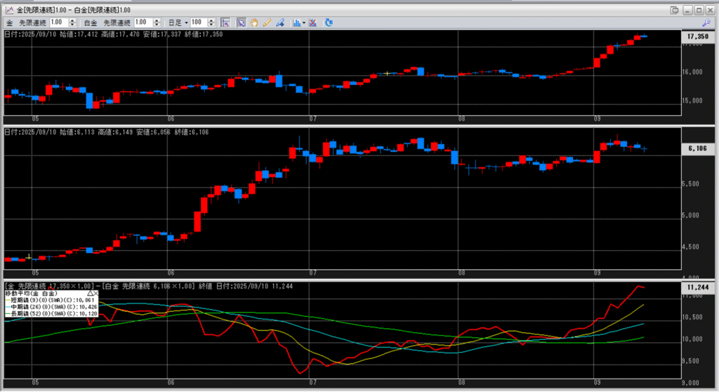 下記に金白金鞘の移動平均線のチャートを貼り付けています。