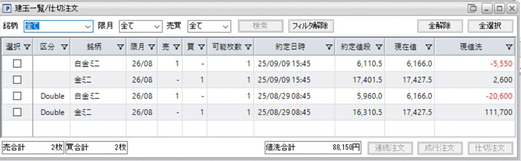 金白金鞘の拡大の仕掛け金ミニ買い1枚-白金ミニ売1枚を2組、保持しています。