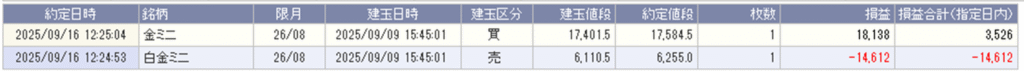 金ミニ買い1枚-白金ミニ売1枚の1組を利確し、3,526円の利益を出しています。