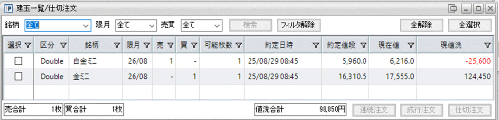 追加した鞘拡大の仕掛け金ミニ買い1枚-白金ミニ売1枚の1組は