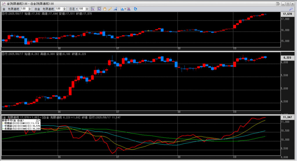 下記に金白金鞘の移動平均線のチャートを貼り付けています。