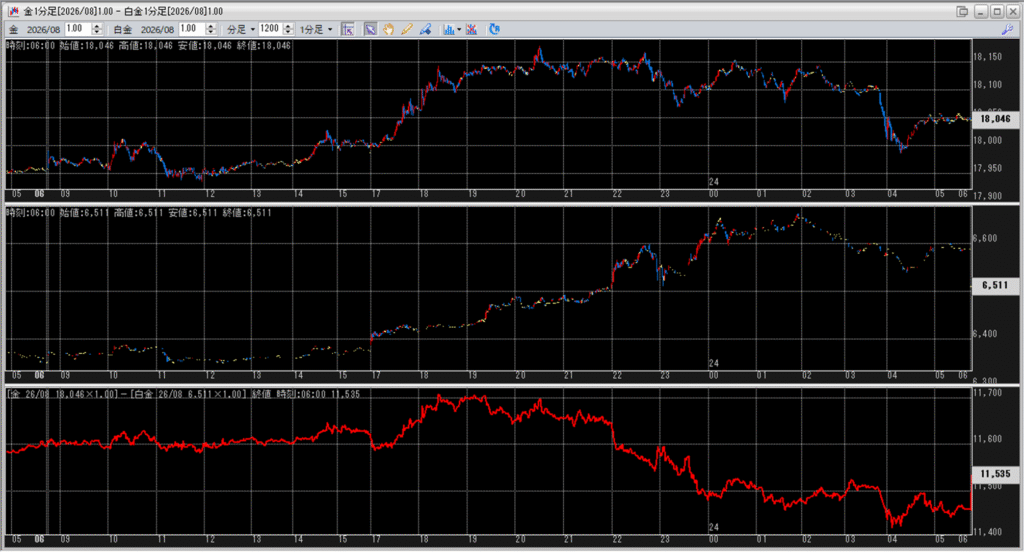 下:金白金鞘(金白金の価格差 = 金1グラムの価格 - 白金1グラムの価格)